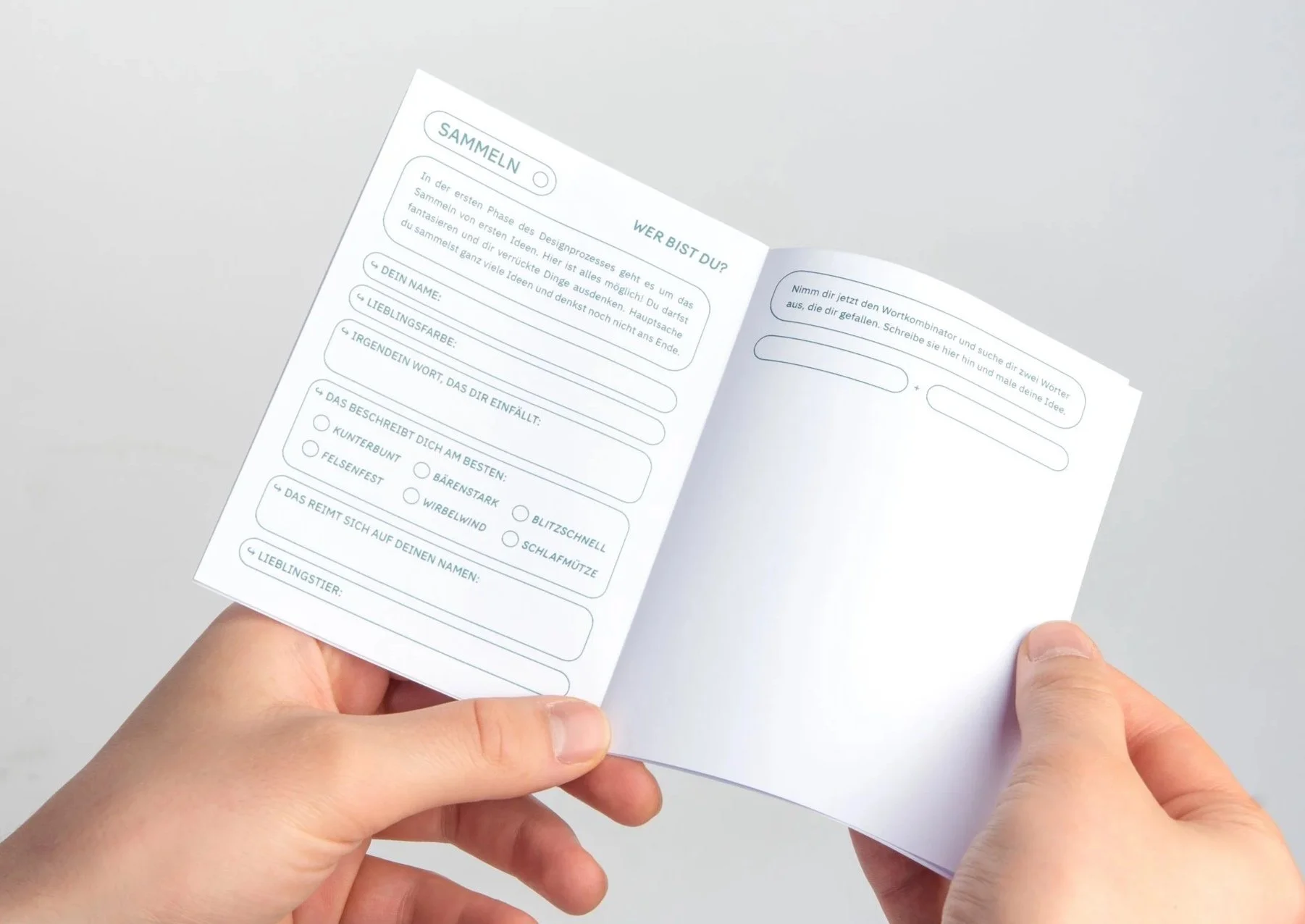 Die Arbeitshefte bilden den zentralen Bestandteil des Workshops. Sie führen die Schüler:innen schrittweise durch einen jeweils definierten Designprozess und strukturieren das kreative Arbeiten während der Unterrichtssequenz. Jedes Arbeitsheft ist einem spezifischen Thema beziehungsweise Designprozess gewidmet, aus denen die Lehrkraft je nach Unterrichtsziel und zeitlichem Rahmen auswählen kann.