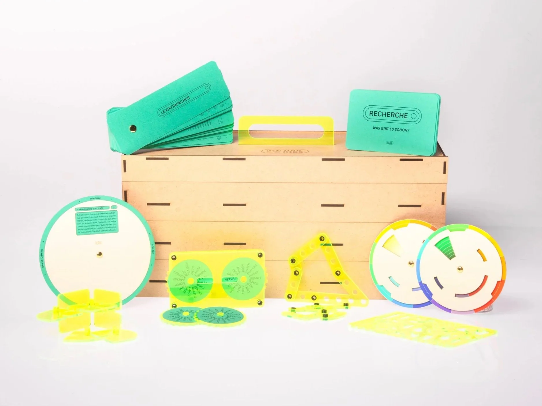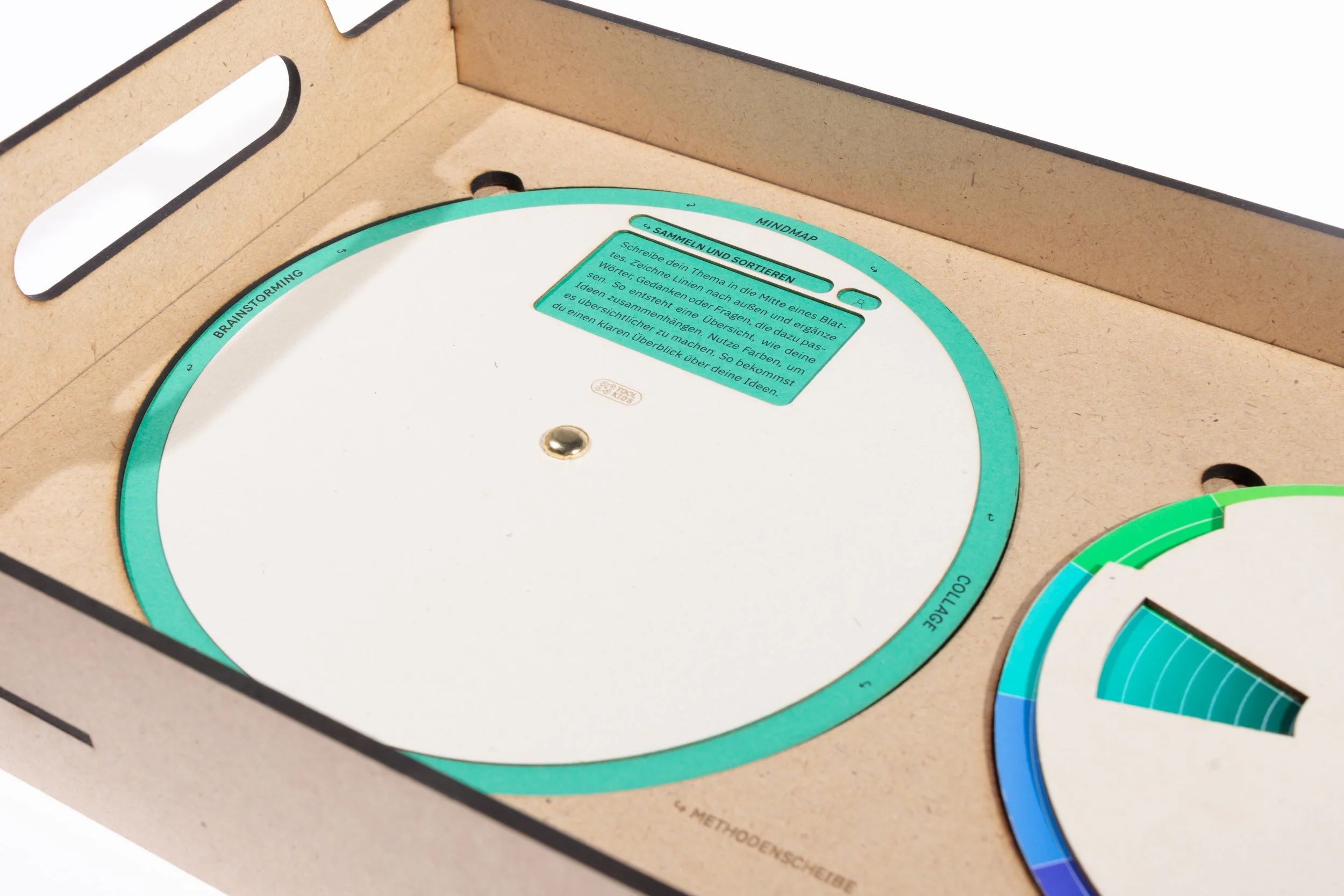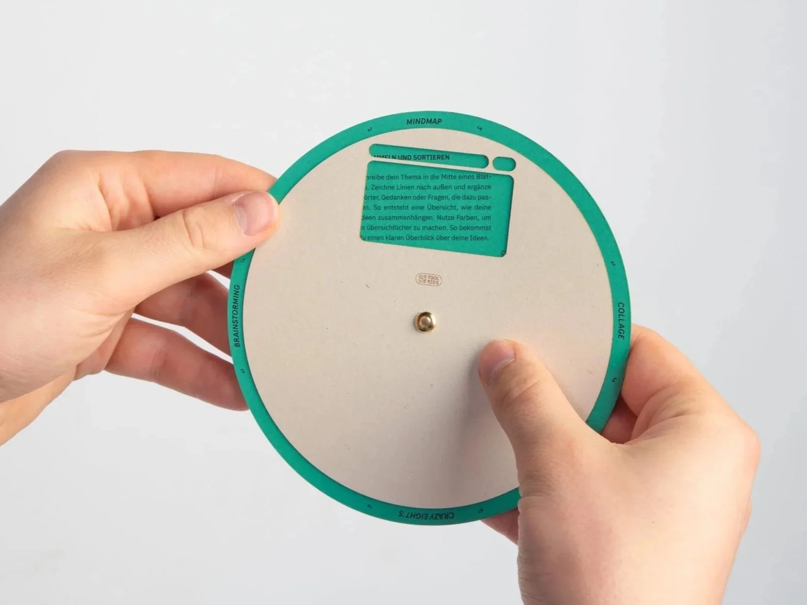 Die Methodenscheibe befasst sich mit verschiedenen Kreativmethoden, die in jedem Designprozess angewandt werden können. In kurzen Überschriften und Texten werden die einzelnen Vorgehensweisen erklärt. Somit kann auch dieses Tool flexibel im Prozess angewandt werden oder je nach Aufgabe explizit gefordert werden. Die Methodenscheibe umfasst auf Vorder- und Rückseite folgende acht Methoden: Mindmap, Collage, Brainstorming, Moodboard, Crazy Eight’s, W-Fragen, Headline und Dot-Voting.