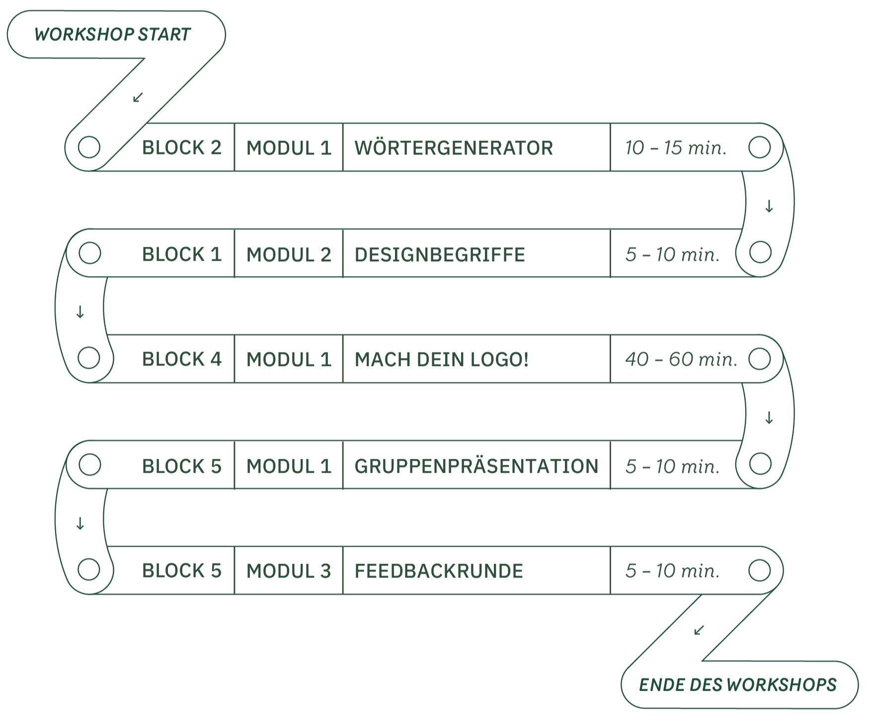 Diese Kombination aus Modulen eignet sich besonders für eine einzelne Doppelstunde, da sie einen schnellen Einstieg ins kreative Arbeiten ermöglicht und den Schwerpunkt klar auf das praktische Gestalten legt. Der Wörtergenerator senkt zu Beginn die Hemmschwelle und hilft den Schüler:innen, ohne lange Vorbereitung ins Denken und Kombinieren zu kommen. Das kurze Sammeln von Designbegriffen schafft ein gemeinsames Grundverständnis, ohne den Arbeitsfluss zu unterbrechen. Anschließend durchlaufen die Kinder einen vollständigen Designprozess mit dem Arbeitsheft Mach dein Logo. Die kurze Gruppenpräsentation macht die Arbeit am Ende sichtbar und stärkt die Selbstwirksamkeit der Schüler:innen. Zum Ende des Workshops findet noch eine Feedbackrunde statt, um das Erlebte zu verarbeiten.