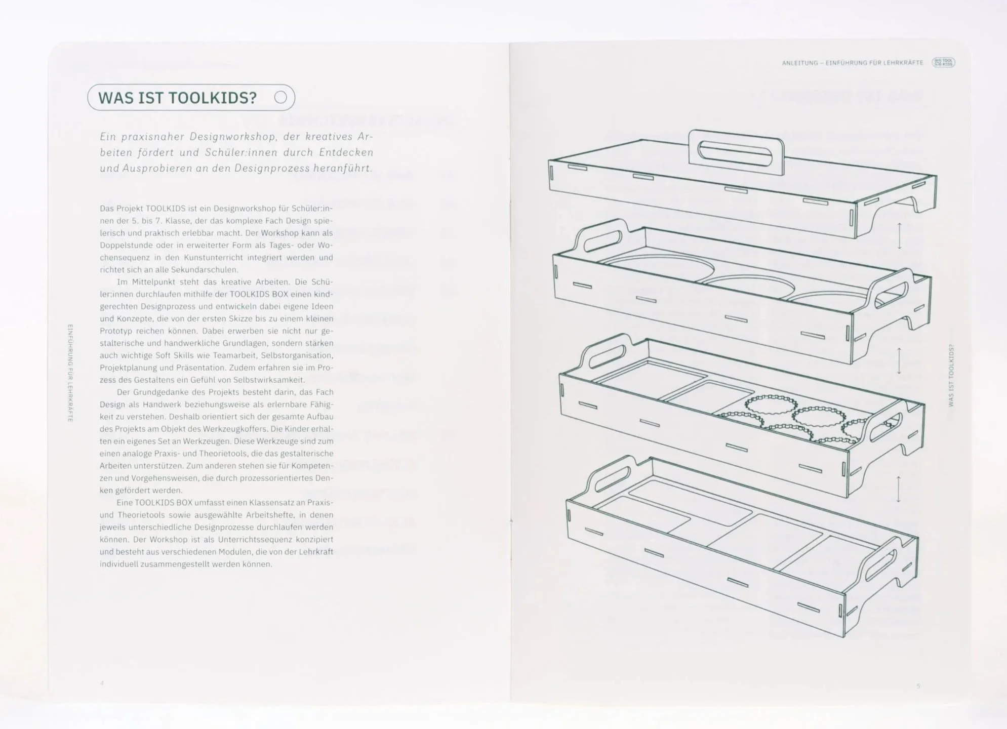 Um den Ablauf des Workshops klar zu strukturieren, ist eine ausführliche Anleitung in Heftform für die Lehrkräfte vorgesehen. Diese führt zunächst in das Konzept des Workshops ein und erläutert anschließend die theoretischen Grundlagen des zugrunde liegenden Designprozesses. Darauf aufbauend wird die Erstellung einer individuellen Unterrichtssequenz mithilfe des Modulplans erklärt. Schritt für Schritt wird die Lehrkraft durch den Aufbau der TOOLKIDS BOX und deren Inhalte geführt.