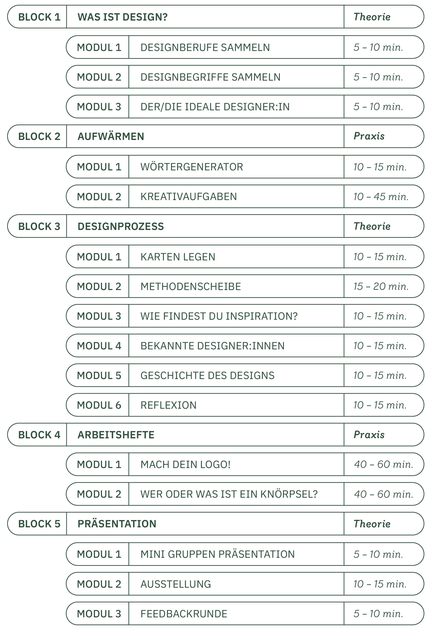 Mithilfe des separaten Modulhandbuchs kann eine individuelle Unterrichtssequenz zusammengestellt werden. Dieser setzt sich aus fünf übergeordneten Themenblöcken zusammen, innerhalb derer jeweils aus mehreren strukturierten Modulen gewählt werden kann.